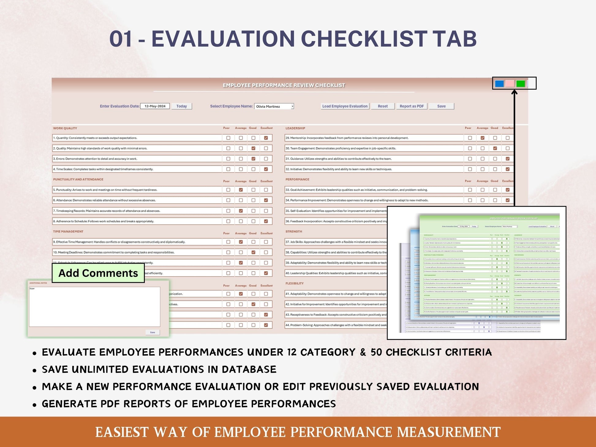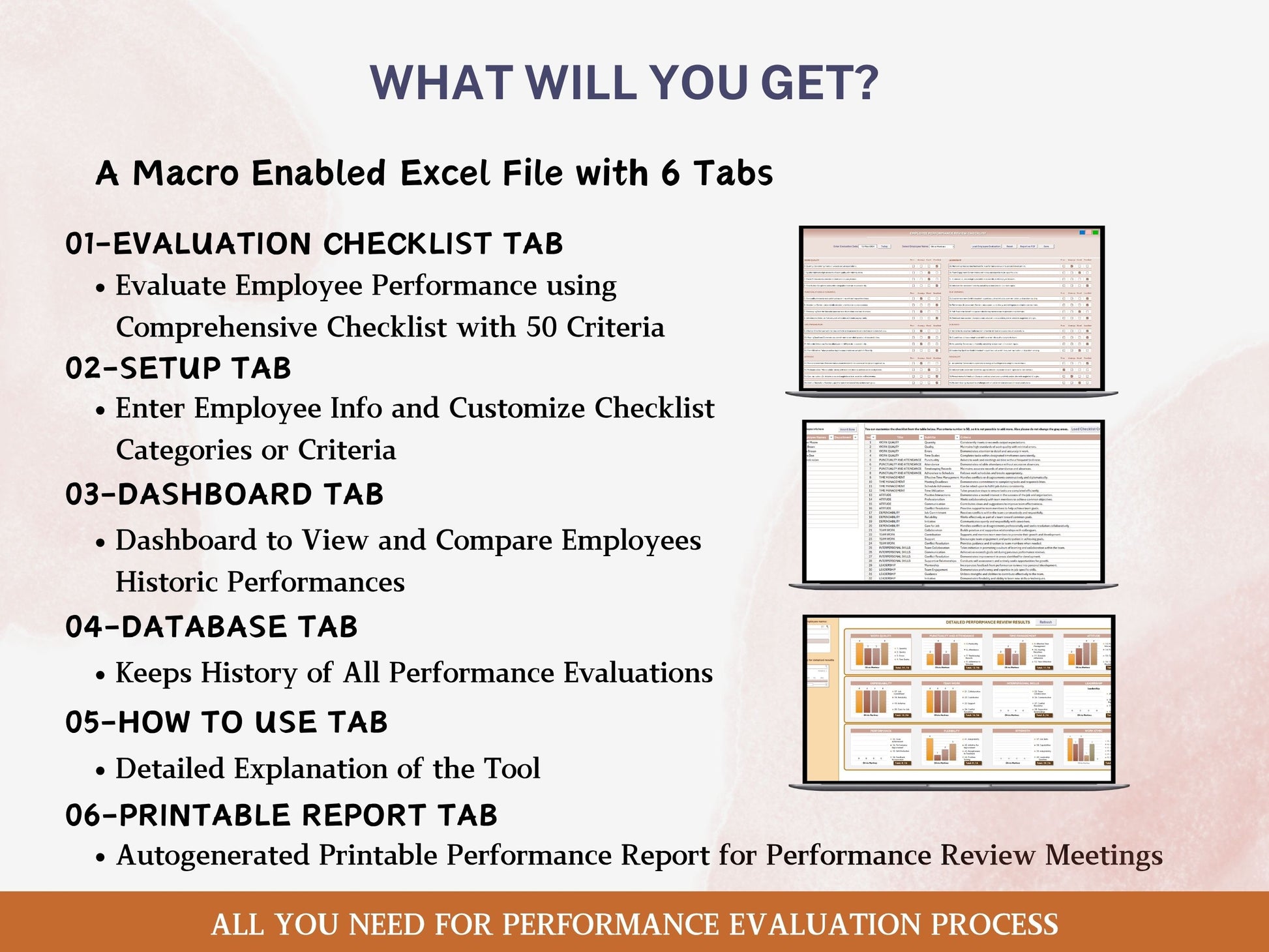 The Employee Performance Review Tool is a powerful Excel-based solution designed to simplify and enhance Human Resources processes. It features a fully customizable evaluation checklist, an interactive performance dashboard, and automated PDF report generation. As a complete staff appraisal system, it helps businesses conduct consistent, efficient, and insightful employee evaluations—ultimately improving overall HR management.